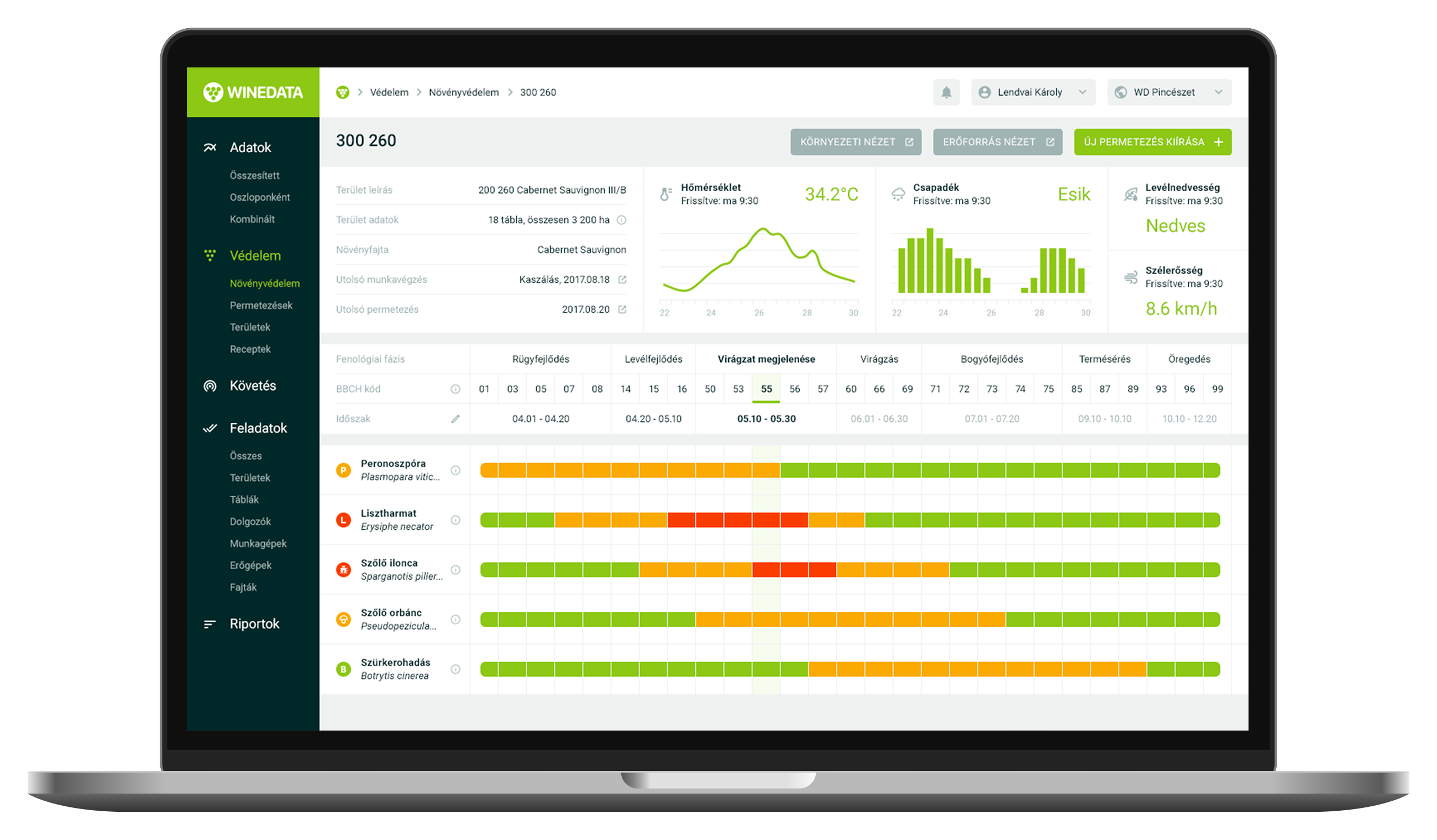 Peronoszpóra fertőzés fejlettségi állapotának jelzése a WineData növényvédelmi modulban. A modul segítségével precízen meghatározható az első permetezés időpontja illetve hatékonyan időzíthetőek a további növényvédelmi munkálatok is.